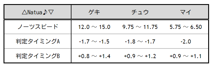 - 値を負にすると、(楽曲基準で同時刻において)判定中心がデフォルトより少し手前になる(LATEが出やすくなる)。正にすれば奥になる。
