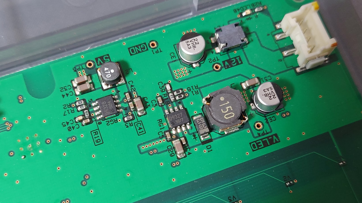 大元の電源は12Vで、LED用とIC用の電源を作っています。
